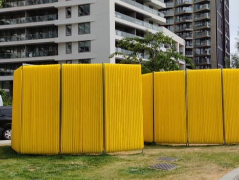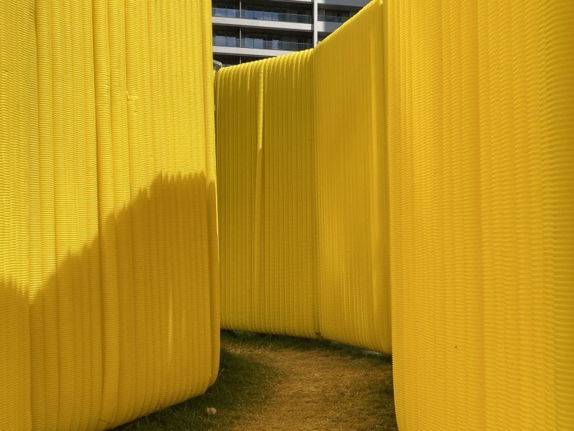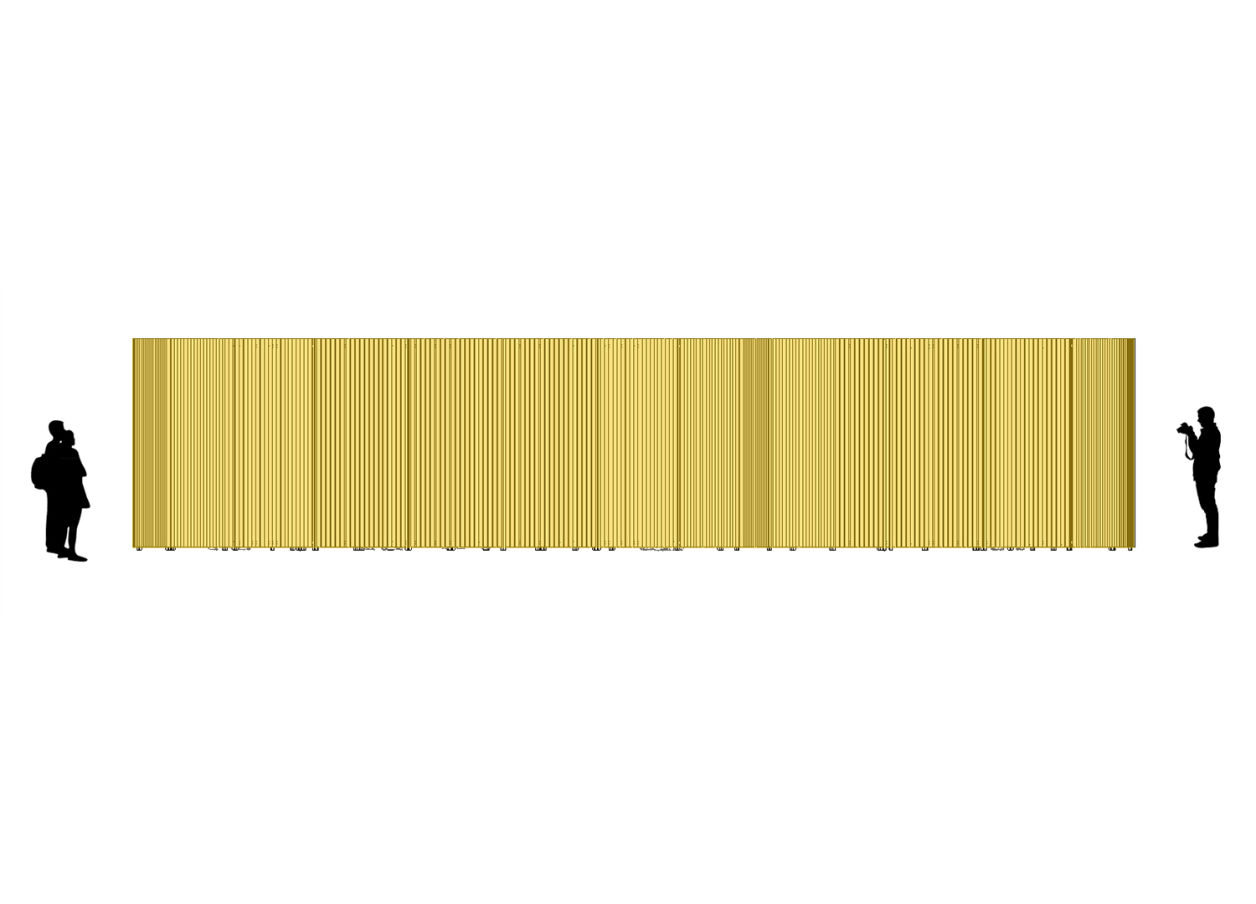À medida que nos aproximamos, notamos que as paredes não são 100% opacas; em vez disso, elas deixam-nos ver o que está por trás, sejam pessoas alegres ou apenas mais uma parede. Finalmente, quando atravessamos o corredor estreito, ficamos imersos na energia calorosa que pode tornar o nosso dia melhor.