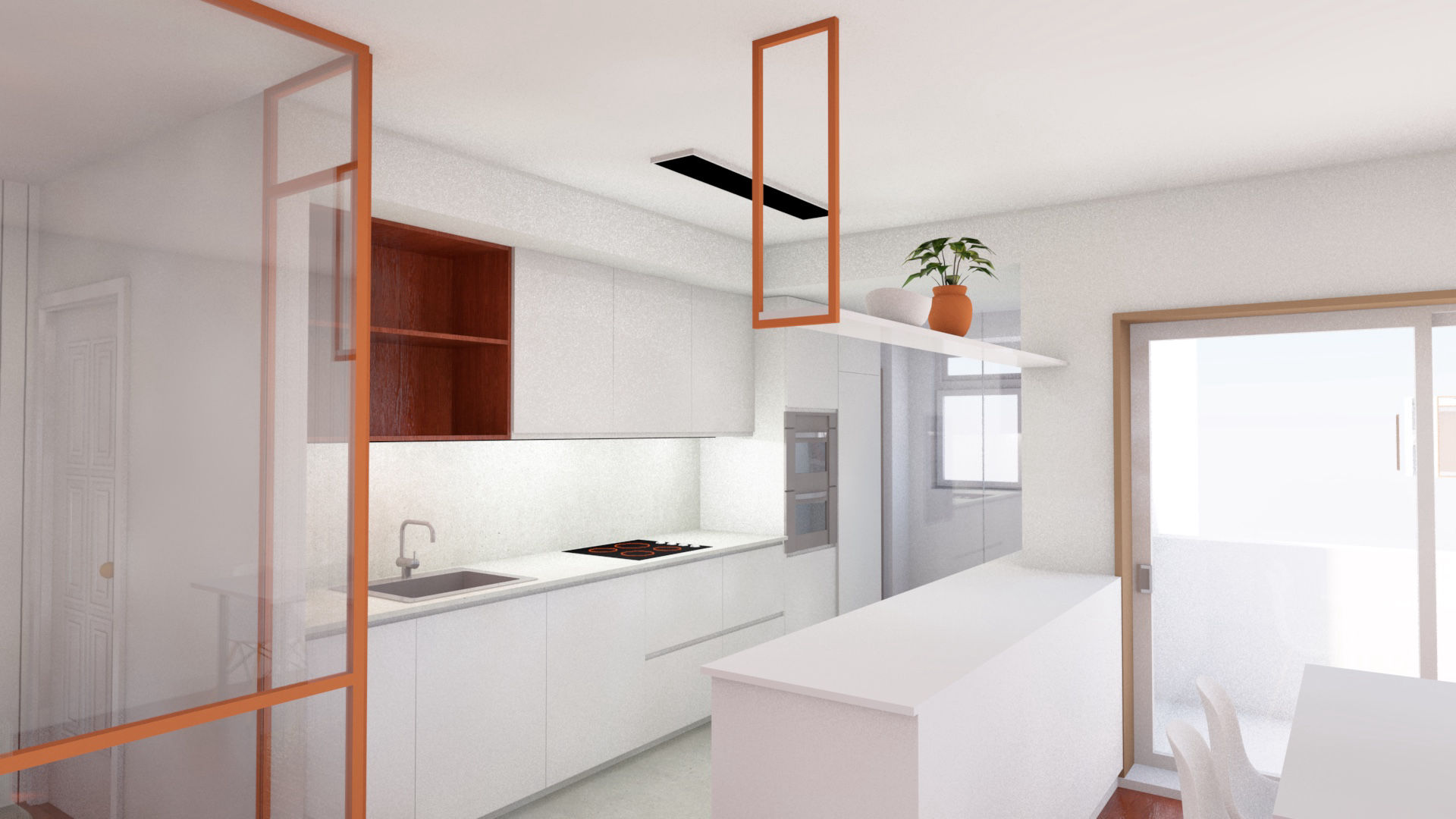 Foi anulada a parede divisória entre a cozinha e a sala e introduzida uma nova divisória entre o hall de entrada, a sala e a cozinha. Este é o elemento que quebra toda a formalidade da casa, transmitindo arrojo e energia a toda a área comum.