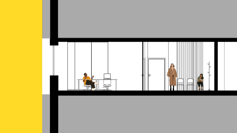 A estrutura do espaço, as diferentes áreas e a forma como se relacionam, assentam neste princípio. Foram consideradas duas áreas com diferentes graus de apropriação: uma área aberta e exposta, semelhante ao espaço social de uma casa que aqui associamos à receção, sala de espera, copa e sala dos funcionários da Viva In onde todos os espaços comunicam entre si, sendo fundamental a relação visual entre todos, como forma de promover uma sensação de fluidez, proximidade e continuidade; e uma outra área, de caráter mais privado, composta por uma sala de reuniões, sala da direção e duas salas de trabalho. Embora sejam áreas independentes, a comunicação visual entre elas é fundamental para se conseguir fluidez no espaço.