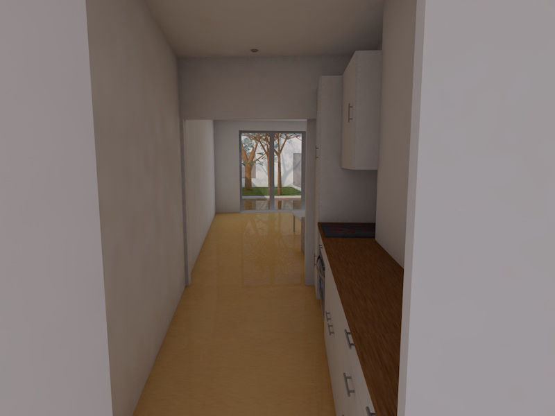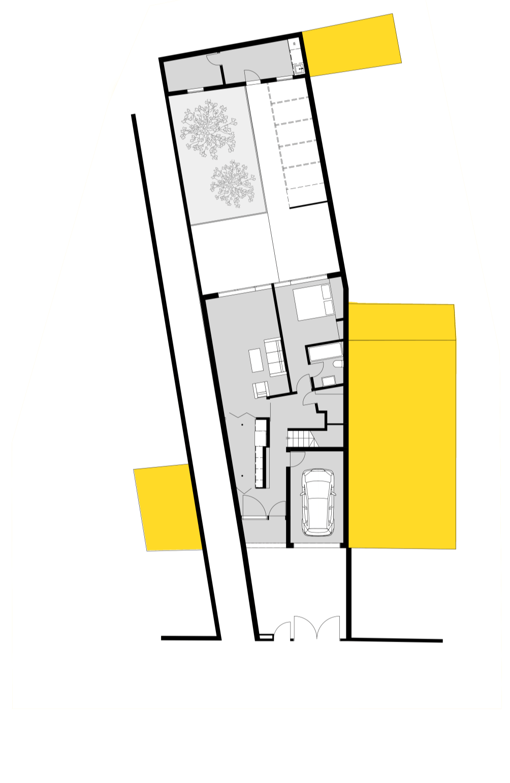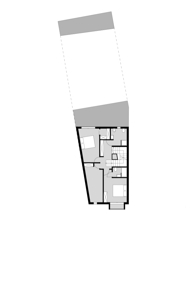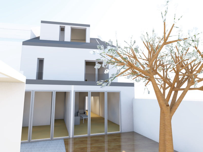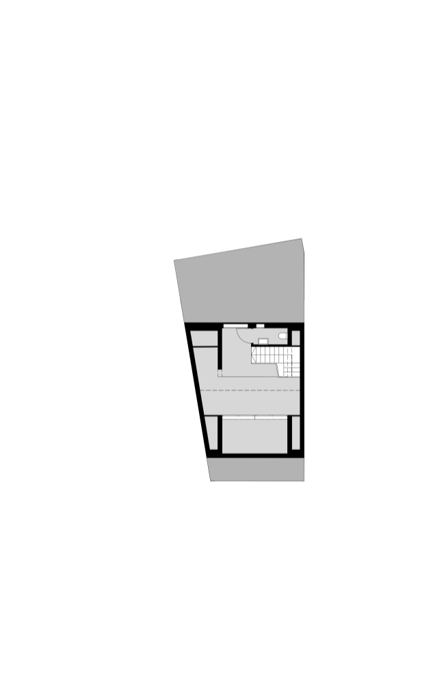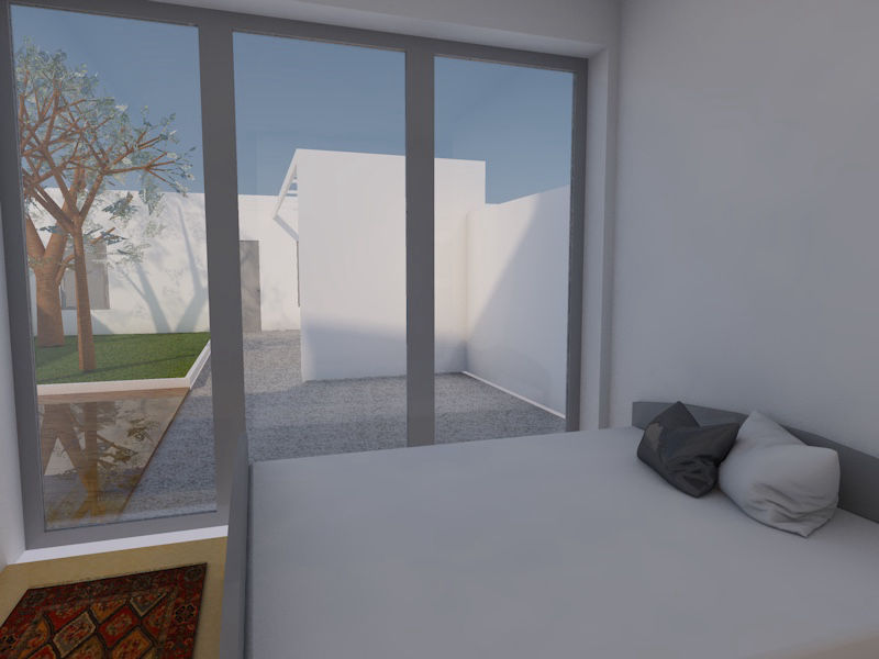 A principal dificuldade era tratar-se de um lote muito estreito, contíguo a um acesso pedonal ao interior do quarteirão, que por isso inviabilizava a abertura de quaisquer vãos a poente; a implantação, assim, seria inevitavelmente muito estreita e comprida com apenas duas frentes - uma a norte e outra a sul. No r/chão, abrimos ao máximo a fachada tardoz ao interior do lote, que seria transformado em jardim e, no piso superior, através de um jogo de formas e volumes, encaixamos dois quartos e duas casas de banho. Conseguimos ainda desenvolver um espaço no aproveitamento do vão do telhado com um pequeno terraço.
