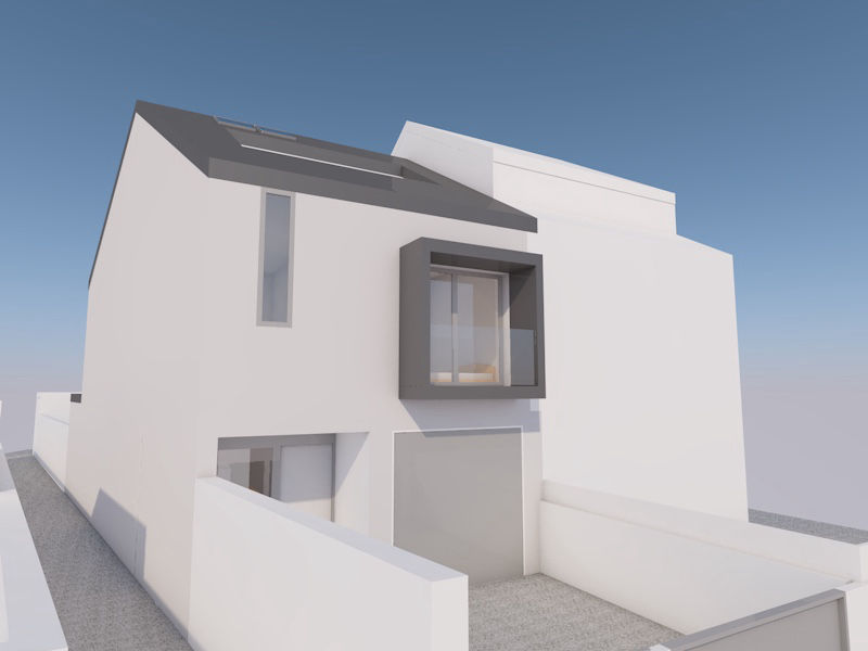O objetivo primário deste projeto era transformar esta casa numa casa com todas as necessidades ao nível do r/chão que servisse uma pessoa com mobilidade condicionada e ampliar a construção de maneira a que este passasse a ser de tipologia T3, com garagem/estacionamento no interior do lote.